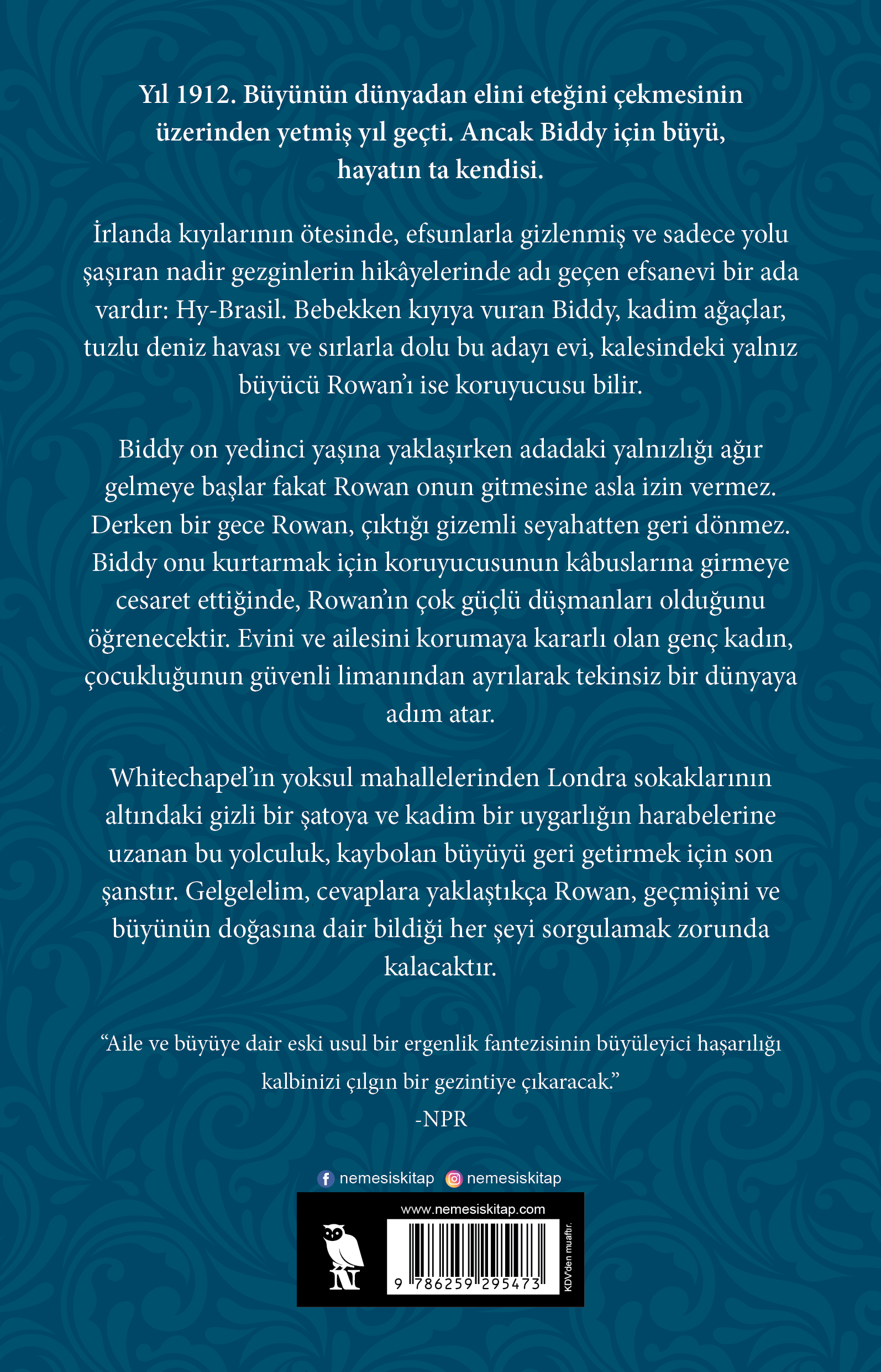 İrlanda kıyılarının ötesinde, efsunlarla gizlenmiş ve sadece yolu şaşıran nadir gezginlerin hikâyelerinde adı geçen efsanevi bir ada vardır: Hy-Brasil. Bebekken kıyıya vuran Biddy, kadim ağaçlar, tuzlu deniz havası ve sırlarla dolu bu adayı evi, kalesindeki yalnız büyücü Rowan’ı ise koruyucusu bilir.