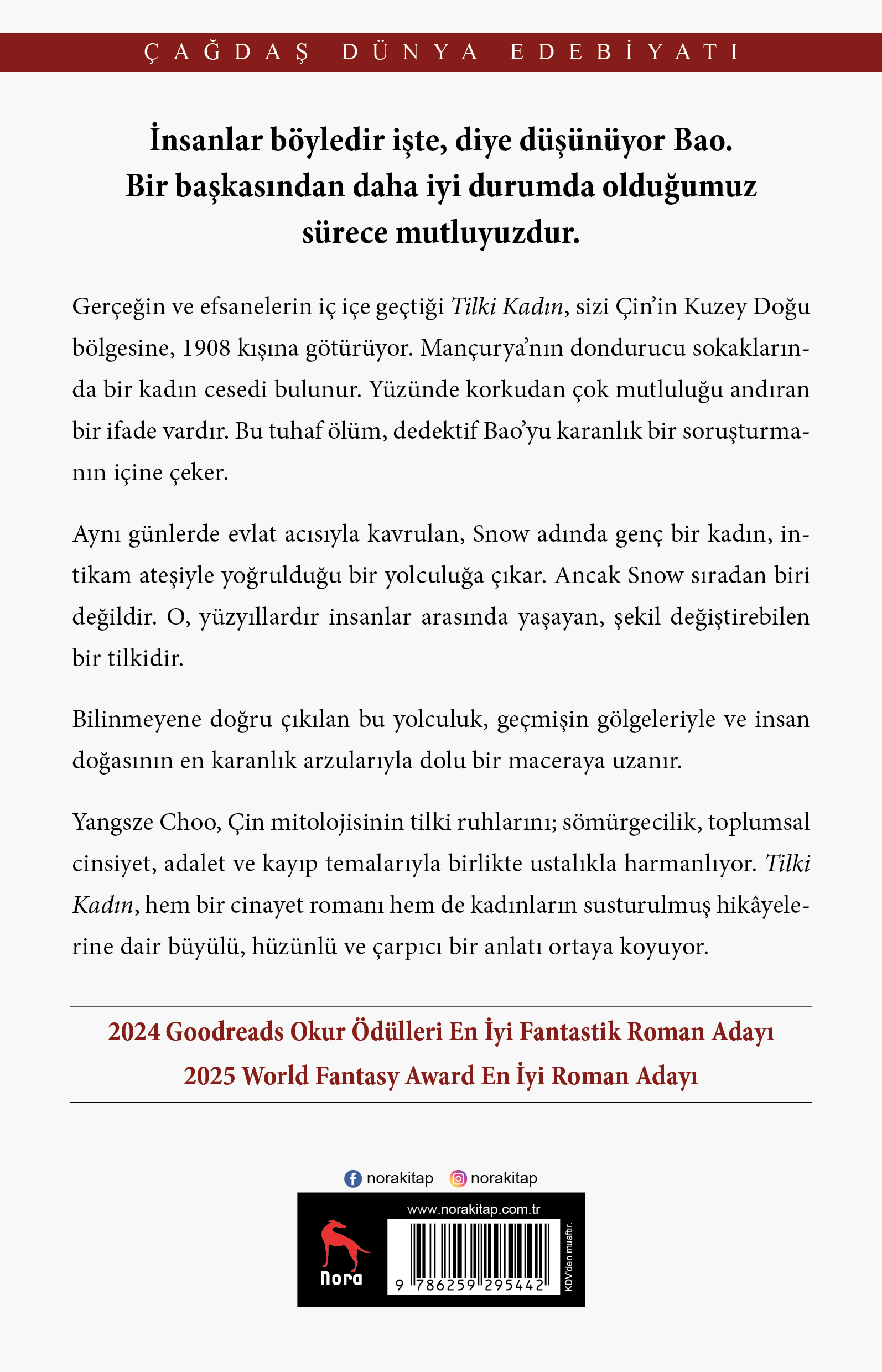 Gerçeğin ve efsanelerin iç içe geçtiği Tilki Kadın, sizi Çin’in Kuzey Doğu bölgesine, 1908 kışına götürüyor. Mançurya’nın dondurucu sokaklarında bir kadın cesedi bulunur. Yüzünde korkudan çok mutluluğu andıran bir ifade vardır. Bu tuhaf ölüm, dedektif Bao’yu karanlık bir soruşturmanın içine çeker.