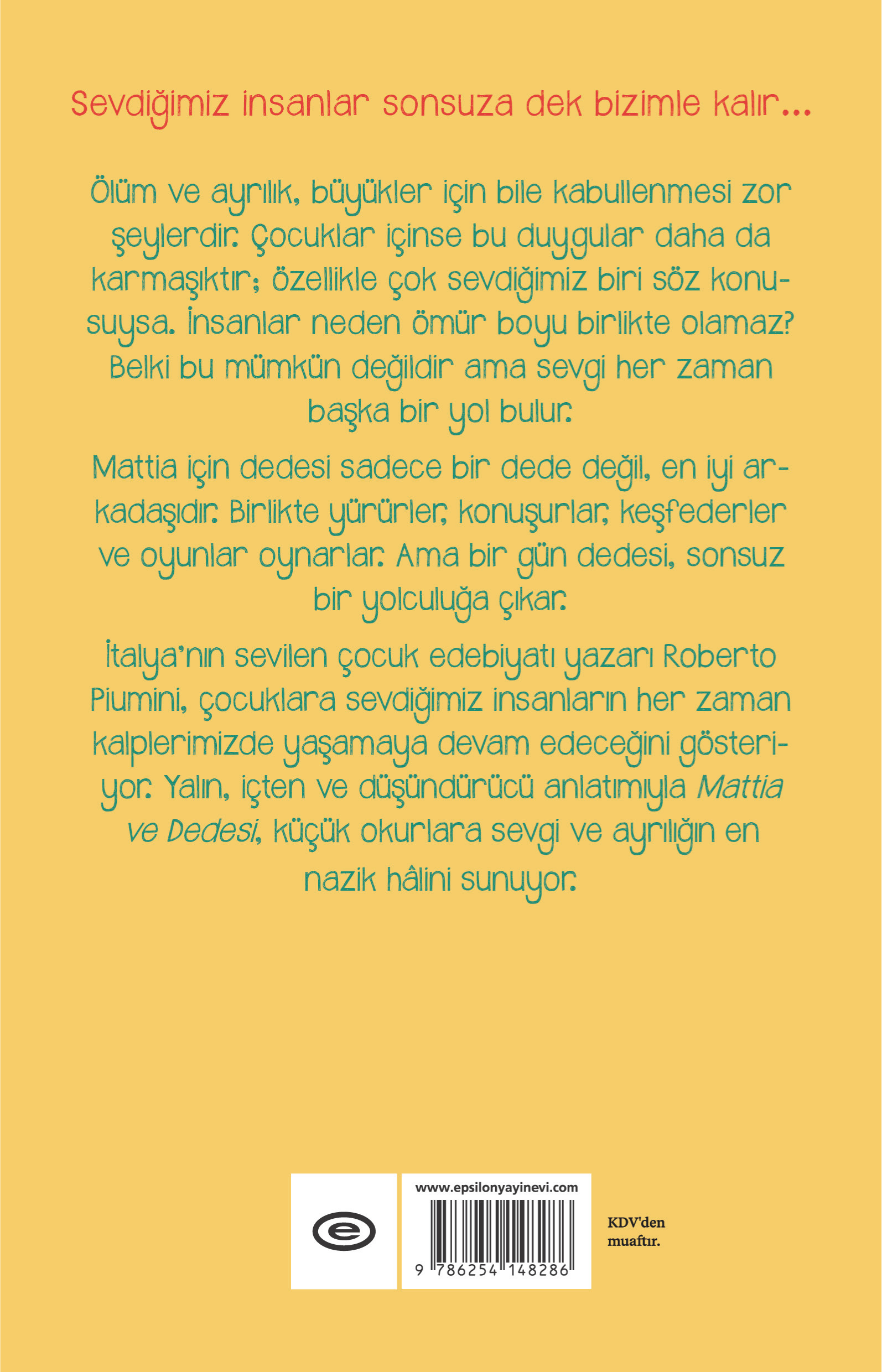 İtalya'nın sevilen çocuk edebiyatı yazarı Roberto Piumini, çocuklara sevdiğimiz insanların her zaman kalplerimizde yaşamaya devam edeceğini gösteriyor. Yalın, içten ve düşündürücü anlatımıyla Mattia ve Dedesi, küçük okurlara sevgi ve ayrılığın en nazik hâlini sunuyor