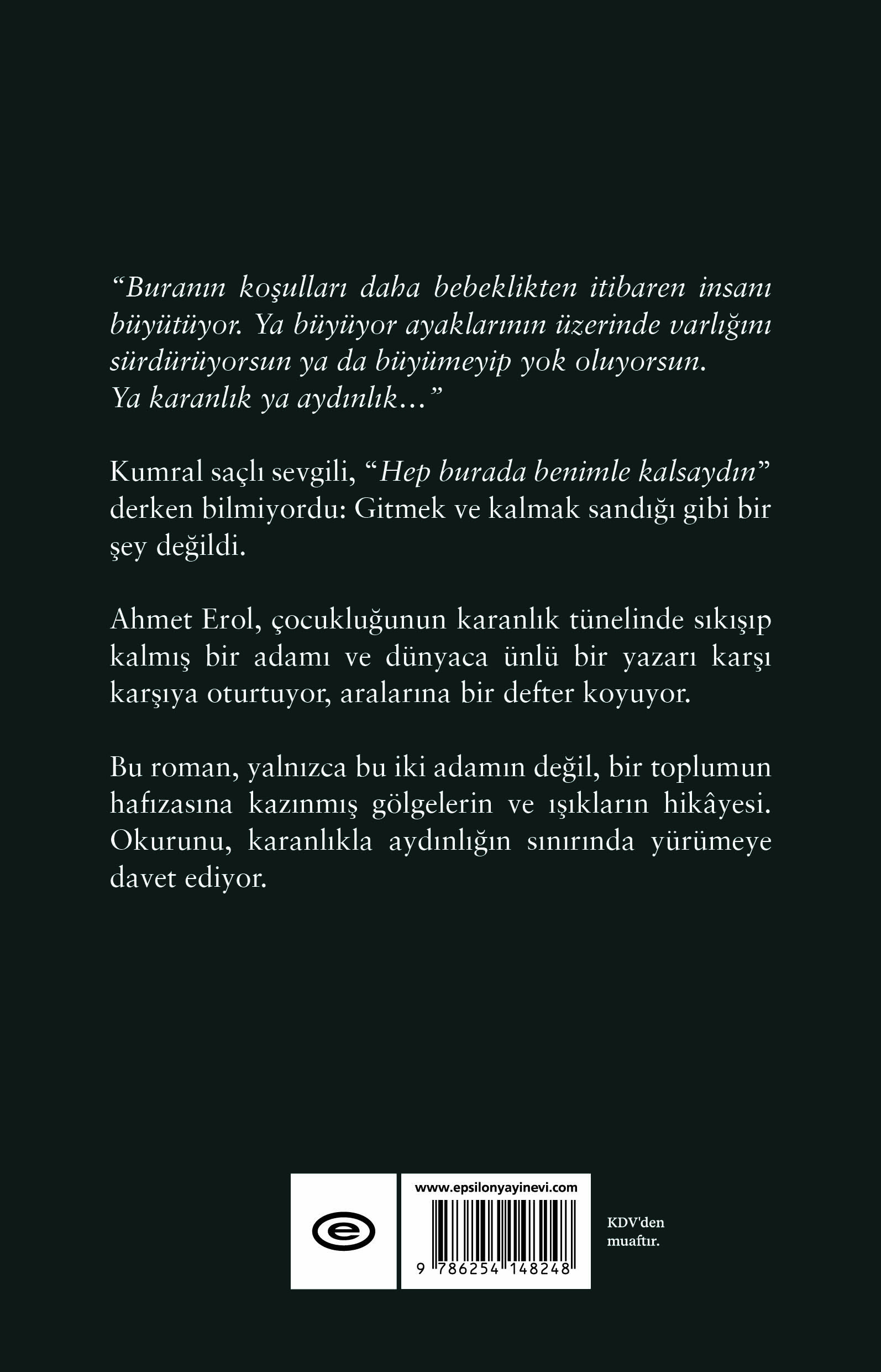 Ahmet Erol, çocukluğunun karanlık tünelinde sıkışıp kalmış bir adamı ve dünyaca ünlü bir yazarı karşı karşıya oturtuyor, aralarına bir defter koyuyor.