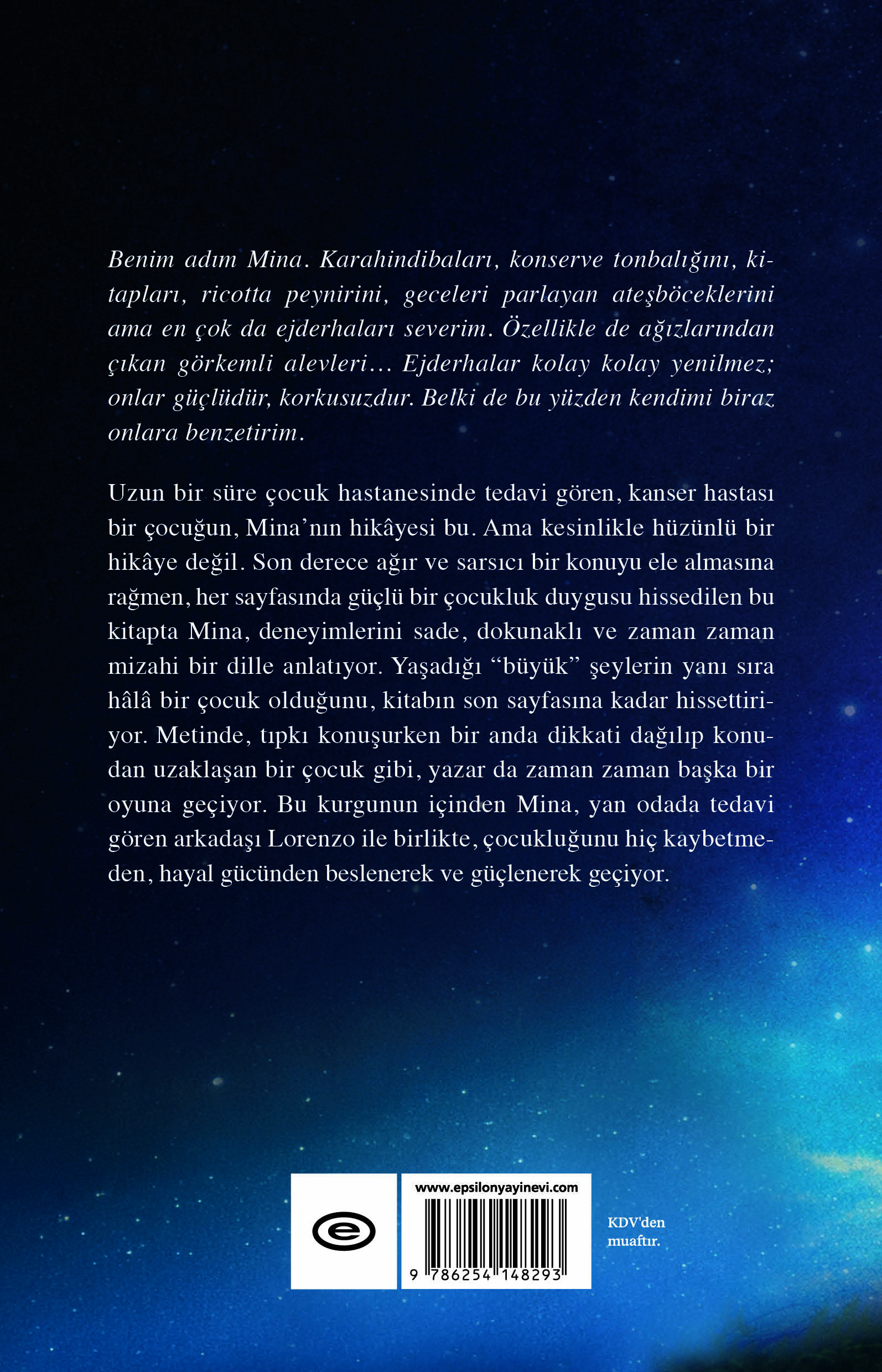 Uzun bir süre çocuk hastanesinde tedavi gören, kanser hastası bir çocuğun, Mina’nın hikâyesi bu. Ama kesinlikle hüzünlü bir hikâye değil. Son derece ağır ve sarsıcı bir konuyu ele almasına rağmen, her sayfasında güçlü bir çocukluk duygusu hissedilen bu kitapta Mina, deneyimlerini sade, dokunaklı ve zaman zaman mizahi bir dille anlatıyor. Yaşadığı “büyük” şeylerin yanı sıra hâlâ bir çocuk olduğunu, kitabın son sayfasına kadar hissettiriyor. Metinde, tıpkı konuşurken bir anda dikkati dağılıp konudan uzaklaşan bir çocuk gibi, yazar da zaman zaman başka bir oyuna geçiyor. Bu kurgunun içinden Mina, yan odada tedavi gören arkadaşı Lorenzo ile birlikte, çocukluğunu hiç kaybetmeden, hayal gücünden beslenerek ve güçlenerek geçiyor.