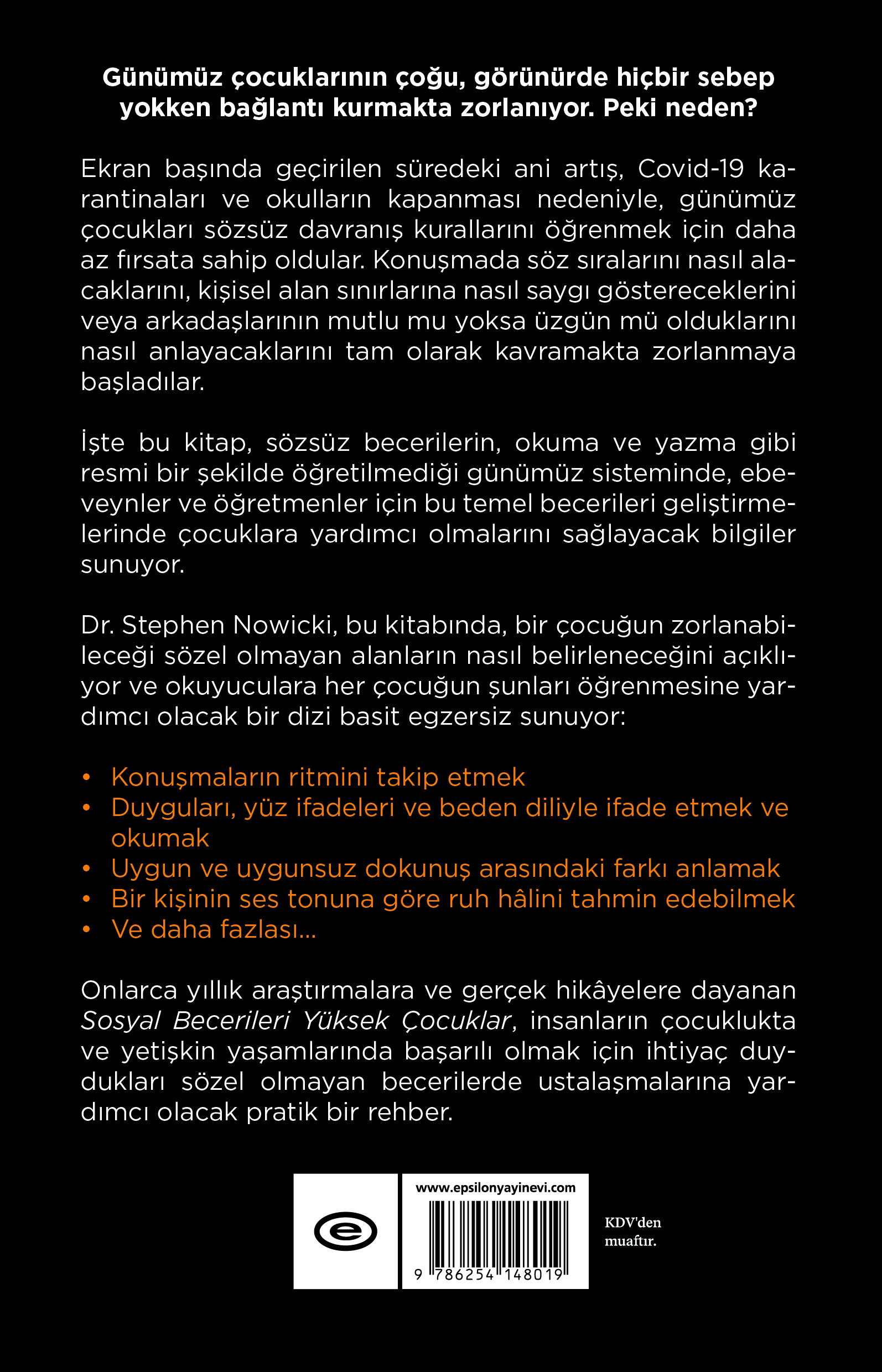 Dr. Stephen Nowicki, bu kitabında, bir çocuğun zorlanabileceği sözel olmayan alanların nasıl belirleneceğini açıklıyor ve okuyuculara her çocuğun şunları öğrenmesine yardımcı olacak bir dizi basit egzersiz sunuyor: