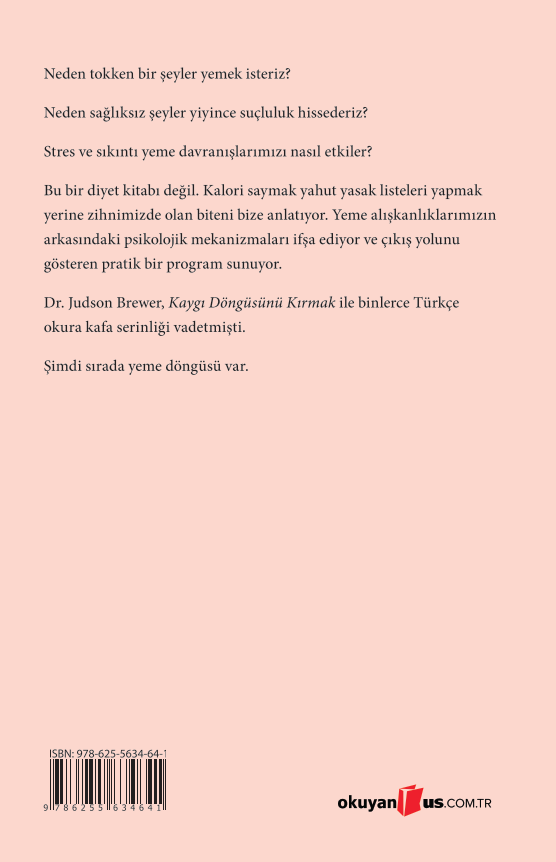 Dünyaca ünlü psikiyatrist ve nörobilim uzmanı Judson Brewer, binlerce okuyucuya ulaşan Kaygı Döngüsünü Kırmak’ın ardından, bu kez yeme alışkanlıklarımızı mercek altına alıyor. Yeme Döngüsünü Kırmak: Aç Olmadığım Halde Neden Yemek İstiyorum? aç olmadığınız halde yeme dürtüsünü tetikleyen davranış ve alışkanlık döngülerini fark etmenizi ve bu döngüleri bilinçli olarak kırmanızı sağlayan bir başvuru kitabı.
