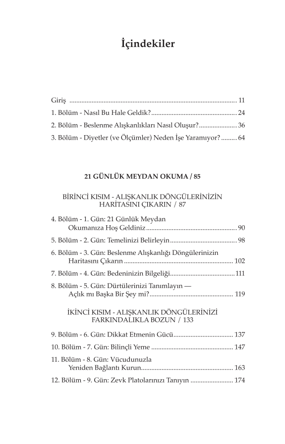 Kitapta aç olmadığınız halde yeme dürtüsünü tetikleyen davranış kalıplarından, yeme döngülerini fark etme ve gözlemleme tekniklerine; mindfulness temelli pratik stratejilerden 21 günlük uygulama planına kadar pek çok araç bulunuyor. Ayrıca yeme alışkanlıkları ile duygular arasındaki ilişkiyi anlamak ve yönetmek için somut örnekler ve öneriler sunuyor.