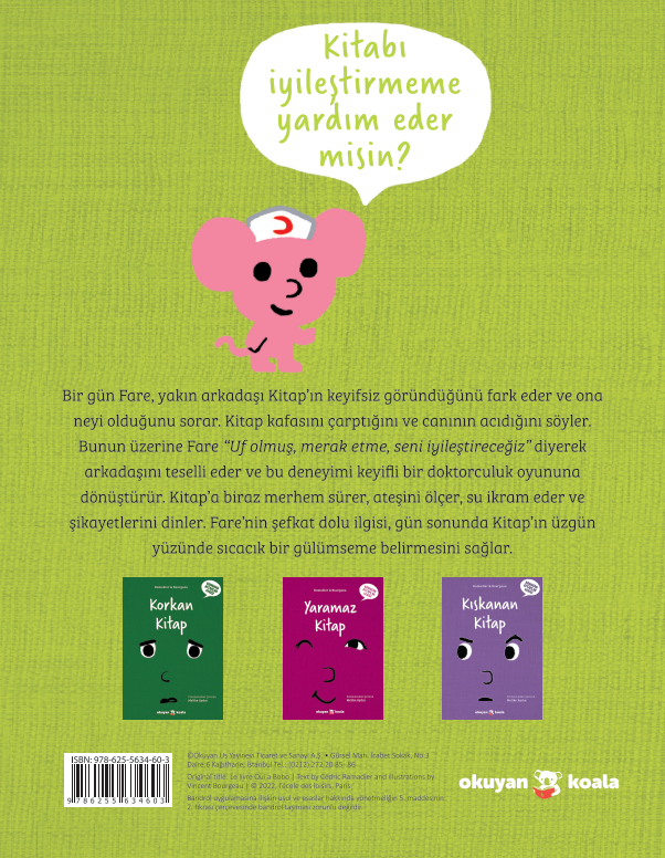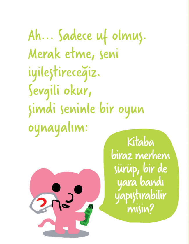 Bir gün Fare, yakın arkadaşı Kitap’ın keyifsiz göründüğünü fark eder ve ona neyi olduğunu sorar. Kitap kafasını çarptığını ve canının acıdığını söyler. Bunun üzerine Fare “Uf olmuş merak etme, seni iyileştireceğiz” diyerek arkadaşını teselli eder ve bu deneyimi keyifli bir doktorculuk oyununa dönüştürür. Kitap’a biraz merhem sürer, ateşini ölçer, su ikram eder ve şikayetlerini dinler. Fare’nin şefkat dolu ilgisi, gün sonunda Kitap’ın üzgün yüzünde sıcacık bir gülümseme belirmesini sağlar.