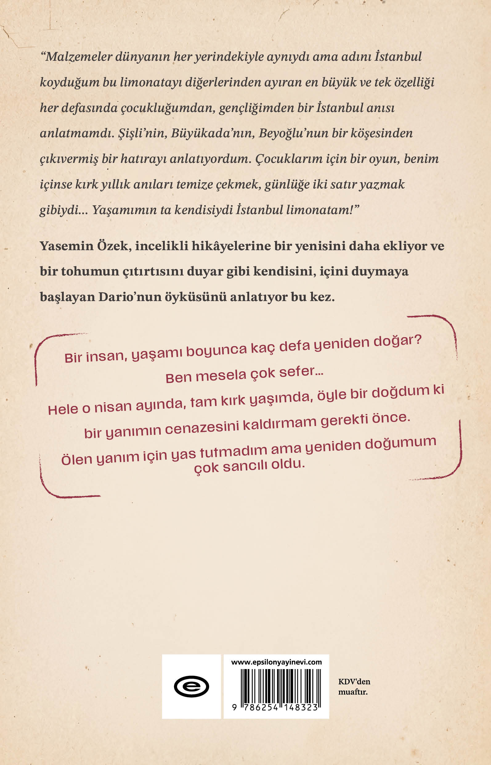 “Malzemeler dünyanın her yerindekiyle aynıydı ama adını İstanbul koyduğum bu limonatayı diğerlerinden ayıran en büyük ve tek özelliği her defasında çocukluğumdan, gençliğimden bir İstanbul anısı anlatmamdı. Şişli’nin, Büyükada’nın, Beyoğlu’nun bir köşesinden çıkıvermiş bir hatırayı anlatıyordum. Çocuklarım için bir oyun, benim içinse kırk yıllık anıları temize çekmek, günlüğe iki satır yazmak gibiydi... Yaşamımın ta kendisiydi İstanbul limonatam!”